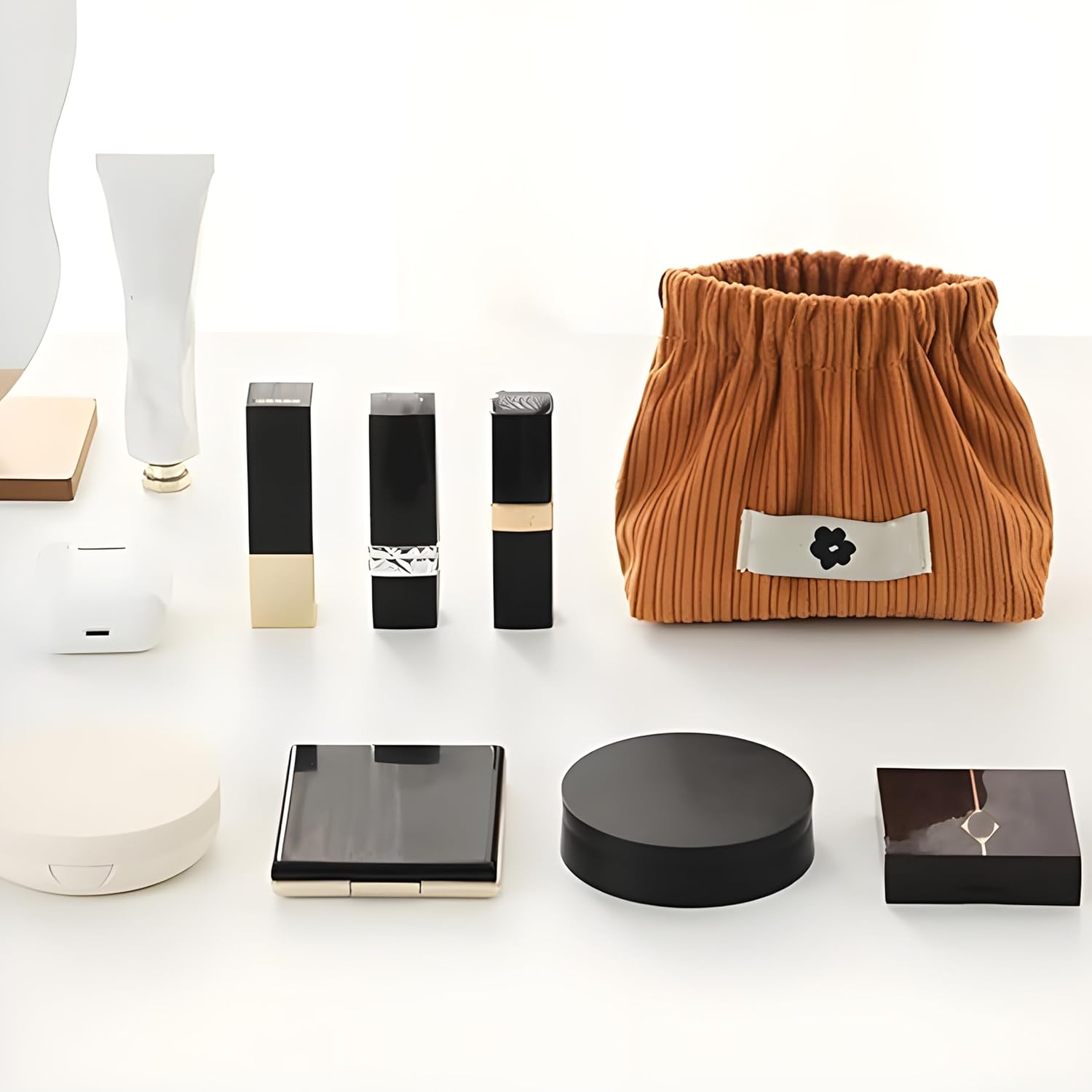 Tired of messy makeup and lost hair ties? This smart storage bag has a special design - just squeeze the sides, and it opens! Let go, and it closes safely.